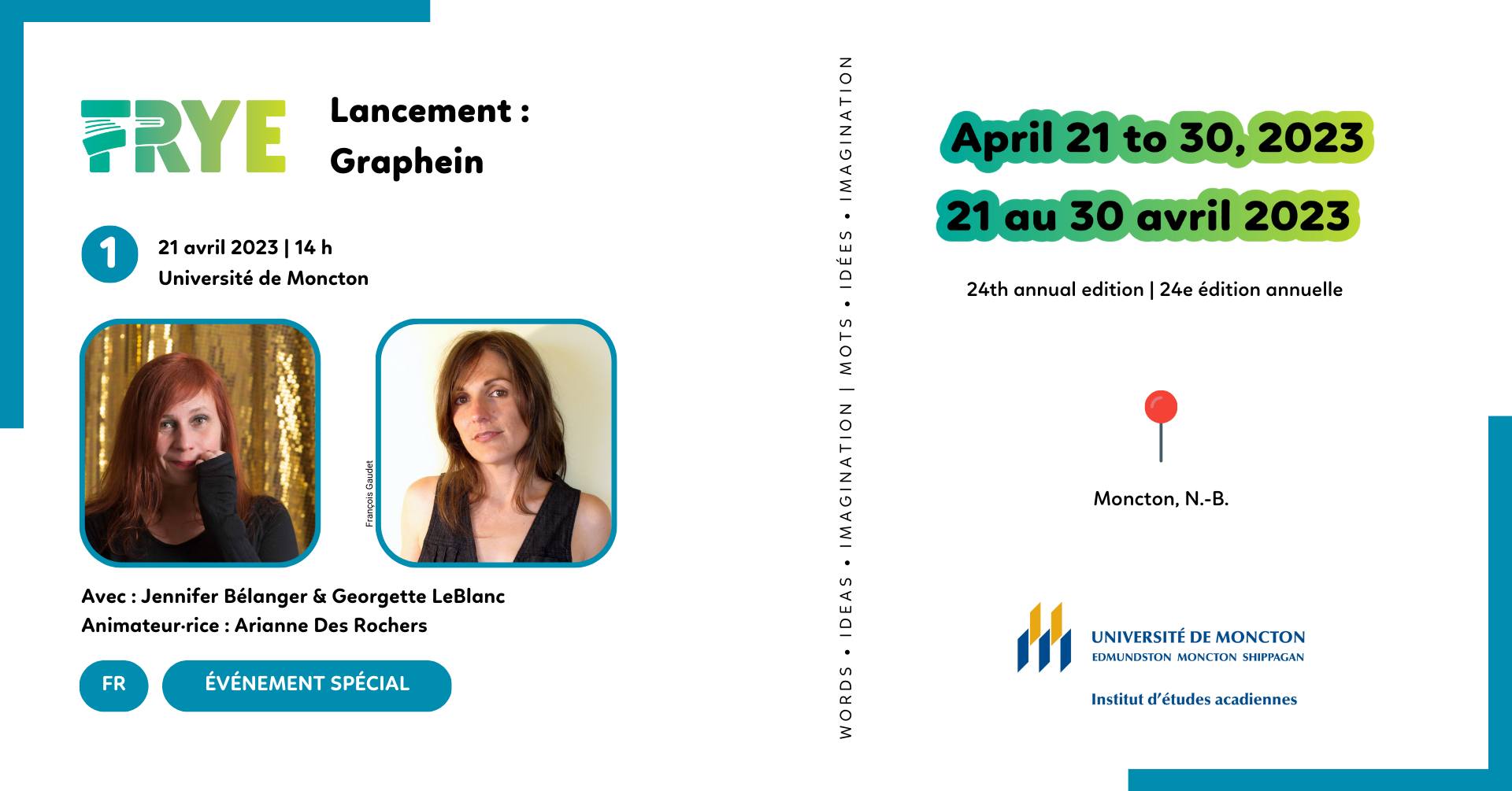 Le projet interdisciplinaire Graphein est une collaboration artistique entre l’artiste visuelle, Jennifer Bélanger et l’écrivaine/poétesse, Georgette LeBlanc qui cherche à rendre visible les différents français parlés sur le territoire. Graphein poursuit une longue tradition de collaboration entre artistes visuels et créateurs littéraires en Acadie. Nous proposons à notre tour le mot comme Art, la rue comme galerie pour les passants, pour rendre visible des mots de leur savoir.