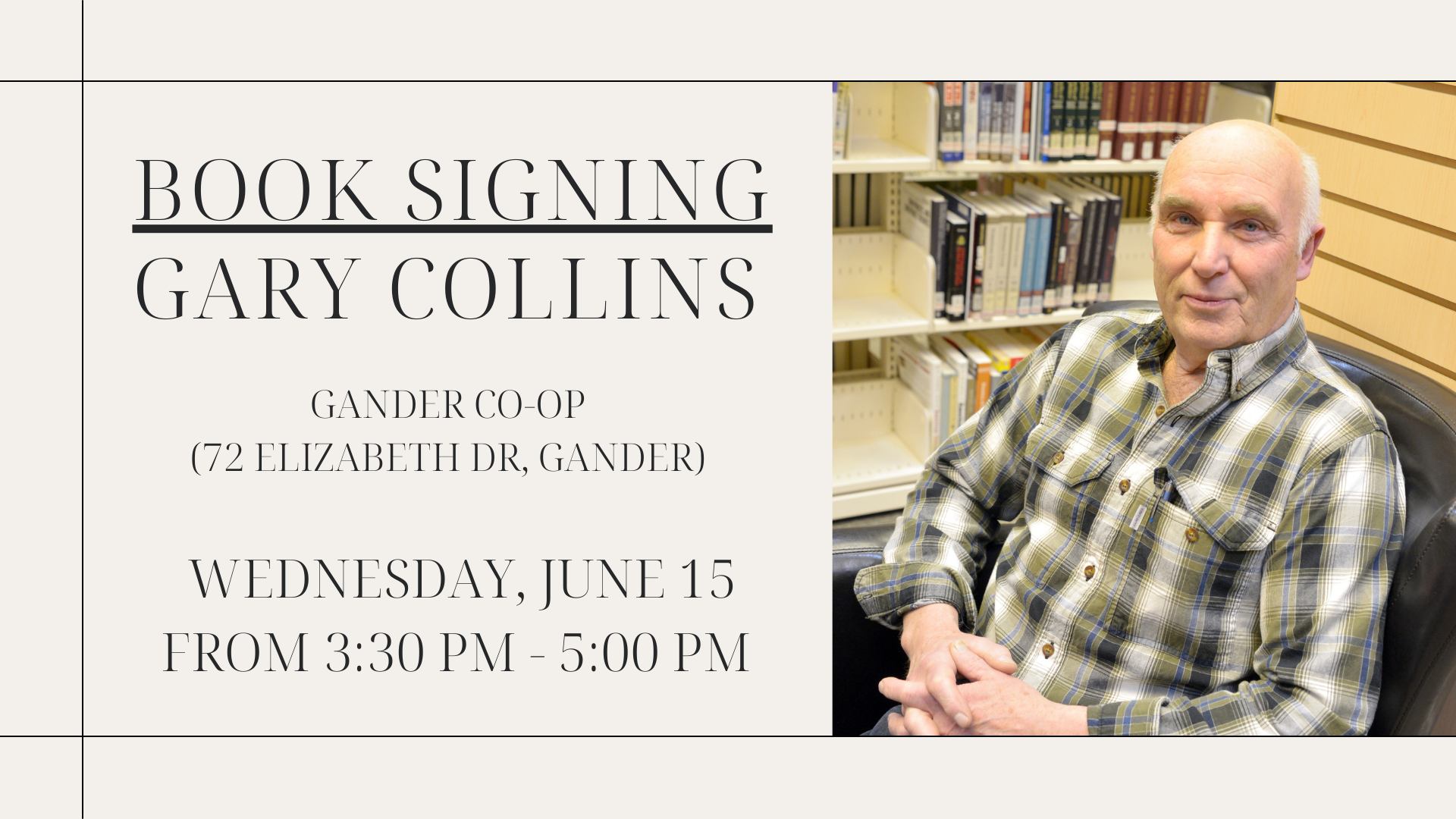 Gander Co-op 72 Elizabeth Drive, GanderGary Collins will be signing copies of his new book, Redjack and other titles, at Gander Co-op (72 Elizabeth Dr, Gander), on Wednesday, June 15 from 3:30 pm - 5:00 […]