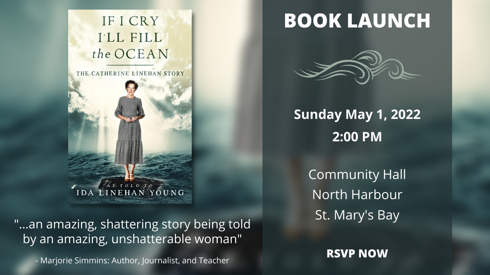 Book launch at the community hall in North Harbour. Catherine will be there God willing and her strength holds up. All public health precautions / rules will be followed.