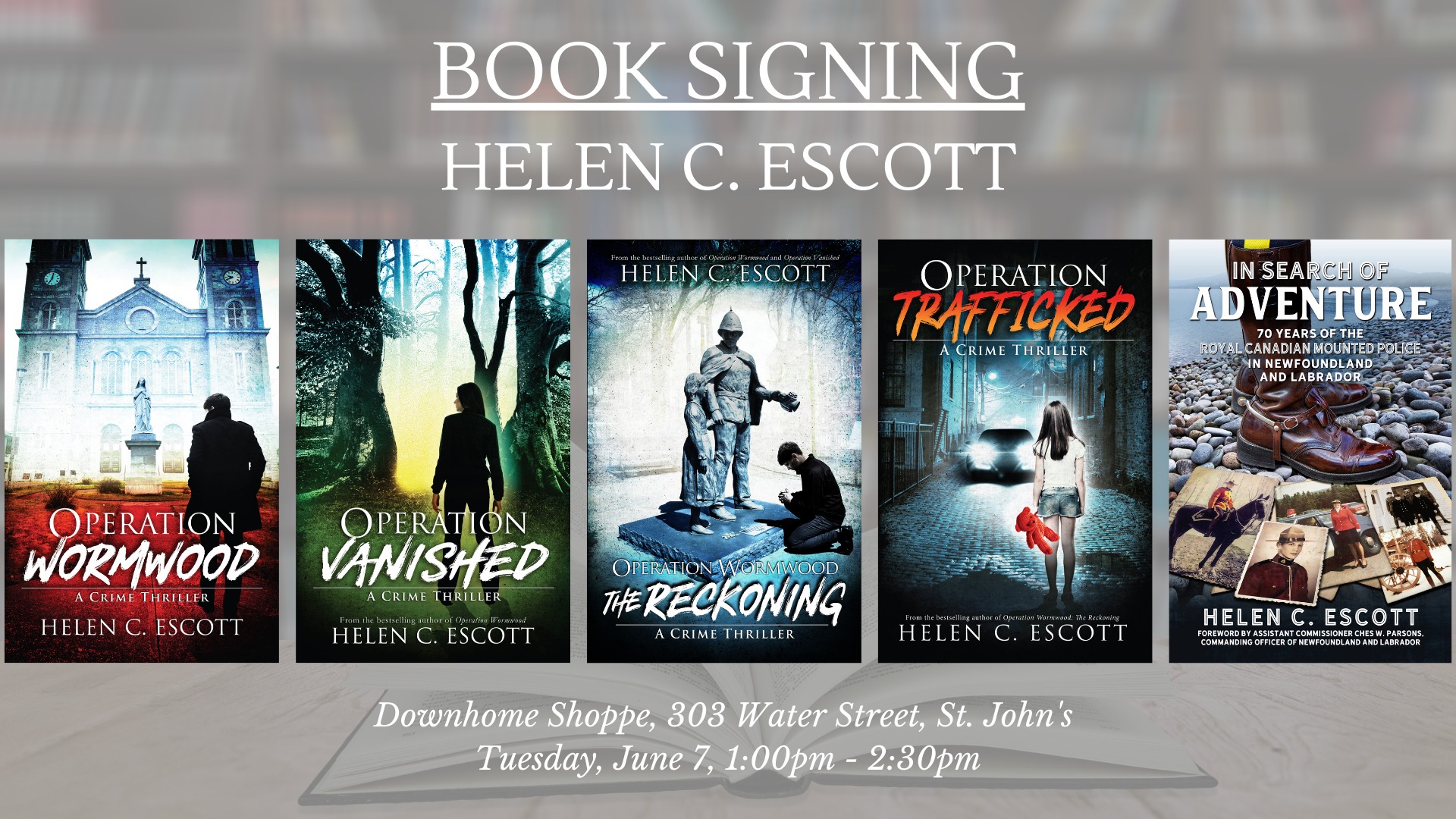 Helen C. Escott will be signing copies of her book, Operation Trafficked, and other titles, on Tuesday, June 7, from 1:00 pm – 2:30 pm at Downhome Shoppe (303 Water St.).