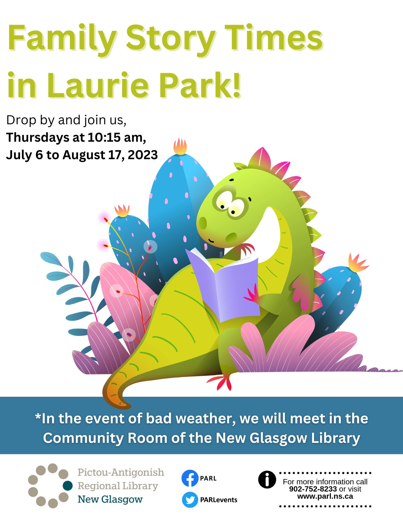 All are welcome to drop by and join us in Laurie Peace Park (next to the New Glasgow Library) for Family Story Times on Thursday mornings this summer! We’ll have stories, and crafts! Please bring your own blankets to sit upon. In case of bad weather, we will meet indoors, in the New Glasgow Library’s Community Room. For more information, please call the New Glasgow Library at (902) 752-8233 or email, newglasgow@parl.ns.ca .