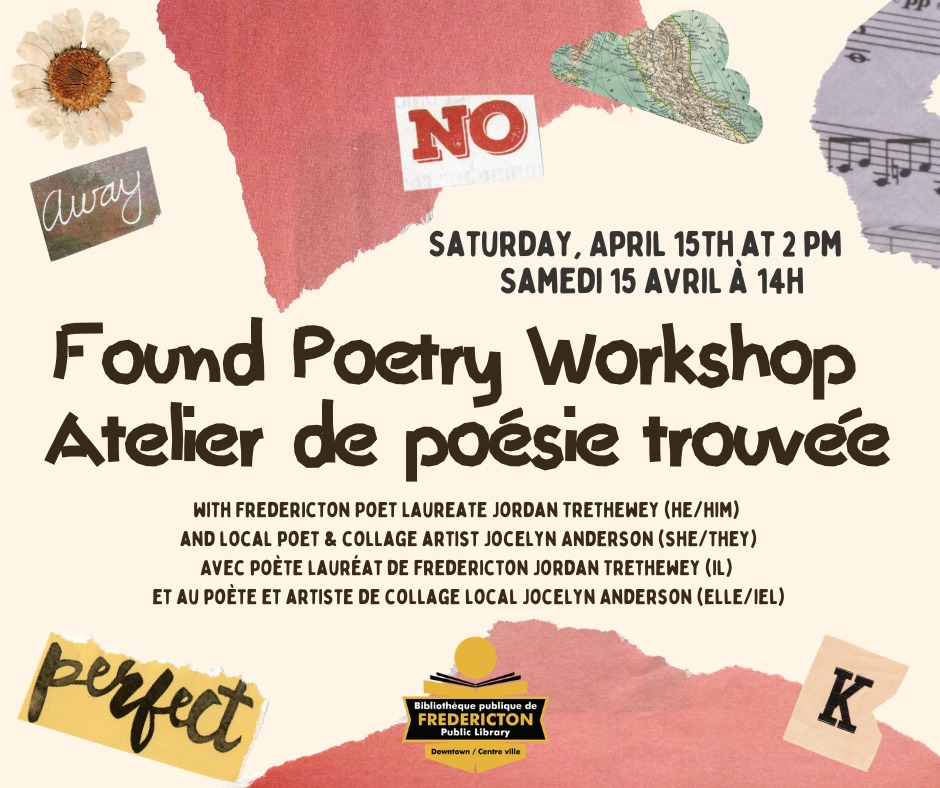 Join Fredericton Poet Laureate Jordan Trethewey (he/him) and local poet & collage artist Jocelyn Anderson (she/they) at 2:00 PM on Saturday, April 15th for a Found Poetry Workshop in the Hub!