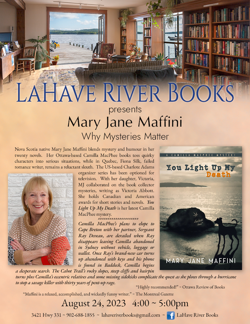 Please join us to hear Mary Jane Maffini on August 24th when she will read from her latest book, You Light Up My Death and talk about Why Mysteries Matter.