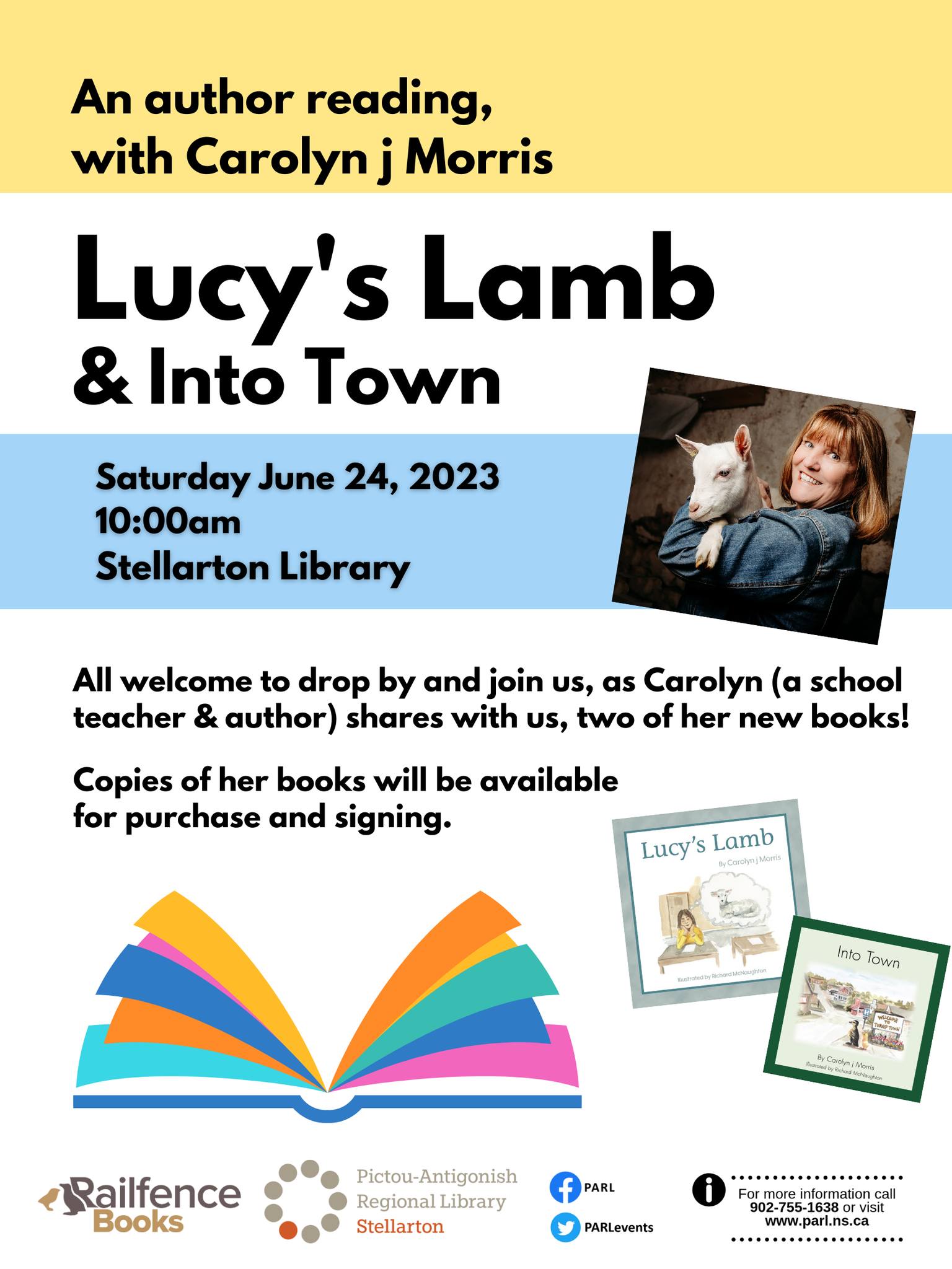 All are welcome to join us for some family fun, as author (and school teacher) Carolyn J. Morris, drops by to share with us some of her newest books – “Lucy’s Lamb” and “Into Town”! Copies of her books will be available for purchase, and signing. For more information, please call the Stellarton Library at (902) 755-1638, or email stellarton@parl.ns.ca .