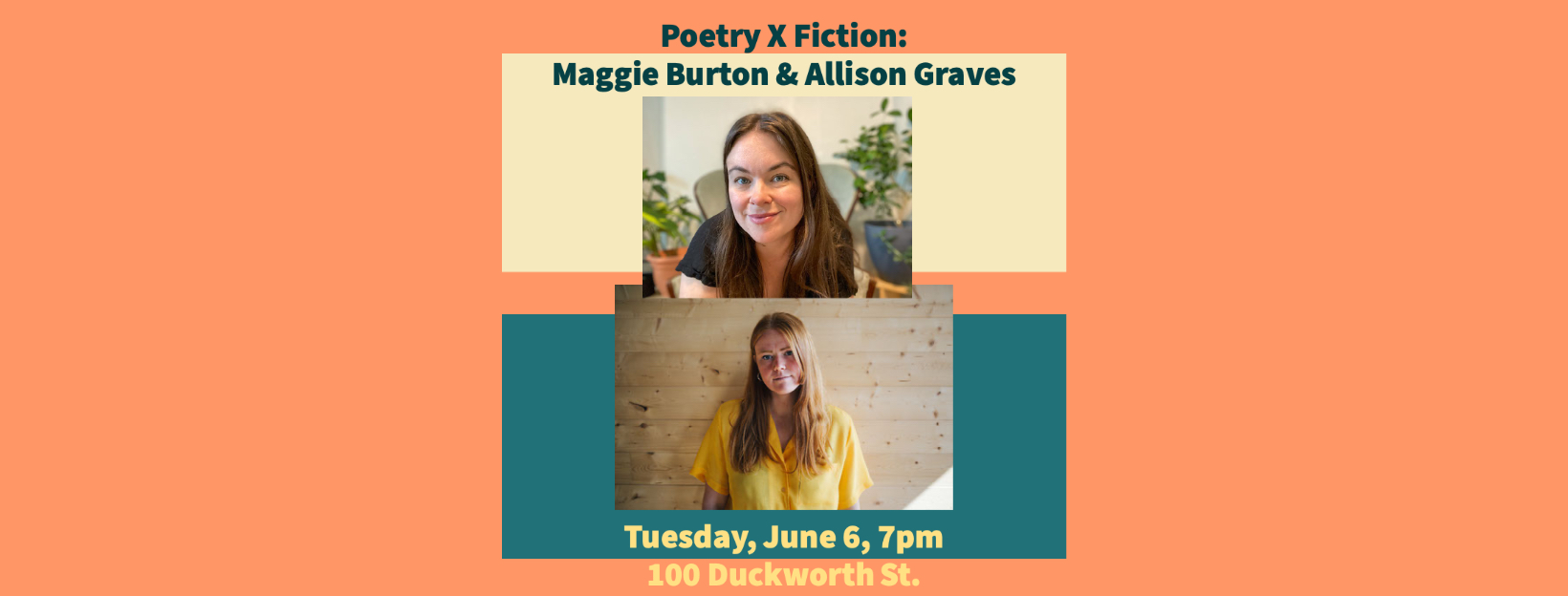 Come out to our first-ever reading event at our first-ever Pop-Up Bookstore! Featuring poet Maggie Burton reading from her new book, CHORES, and Allison Graves reading from her forthcoming collection, SOFT SERVE — plus a store that’s loaded with local books from local writers and publishers!