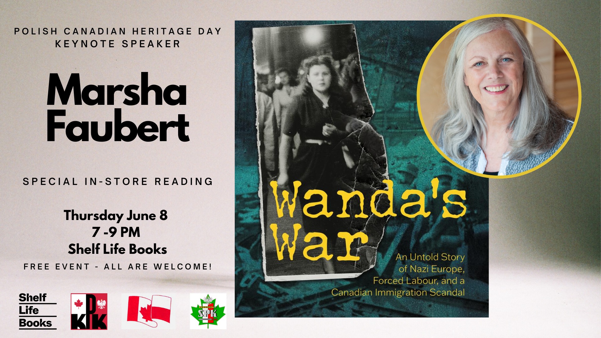 Join Shelf Life Books and for a special in-store reading with the Polish Canadian Heritage Day keynote speaker, Marsha Faubert. For the evening, Faubert will read from her new book Wanda’s War: An Untold Story of Nazi Europe, Forced Labour, and a Canadian Immigration Scandal (Goose lane Editions 2023), followed by a Q&A period.