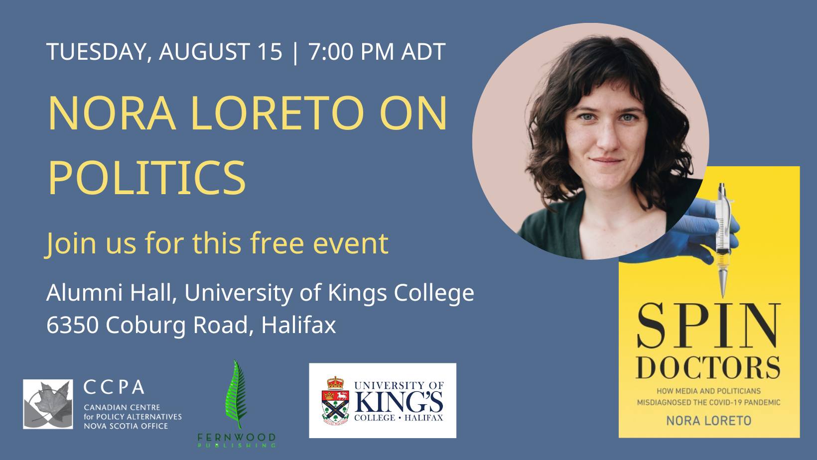 In partnership with Fernwood Publishing and the University of Kings College, join us Tuesday, August 15th, for an evening with Nora Loreto, in conversation with CBC Mainstreet Nova Scotia’s Jeff Douglas. Nora is an author, podcast host, activist, and journalist. Author of multiple books, including Spin Doctors, Take Back the Fight, and From Demonized to Organized. Nora Loreto is on half of the podcast, Sandy and Nora Talk Politics, a show that helps Canadians “look at politics, society, the economy and social movements.”