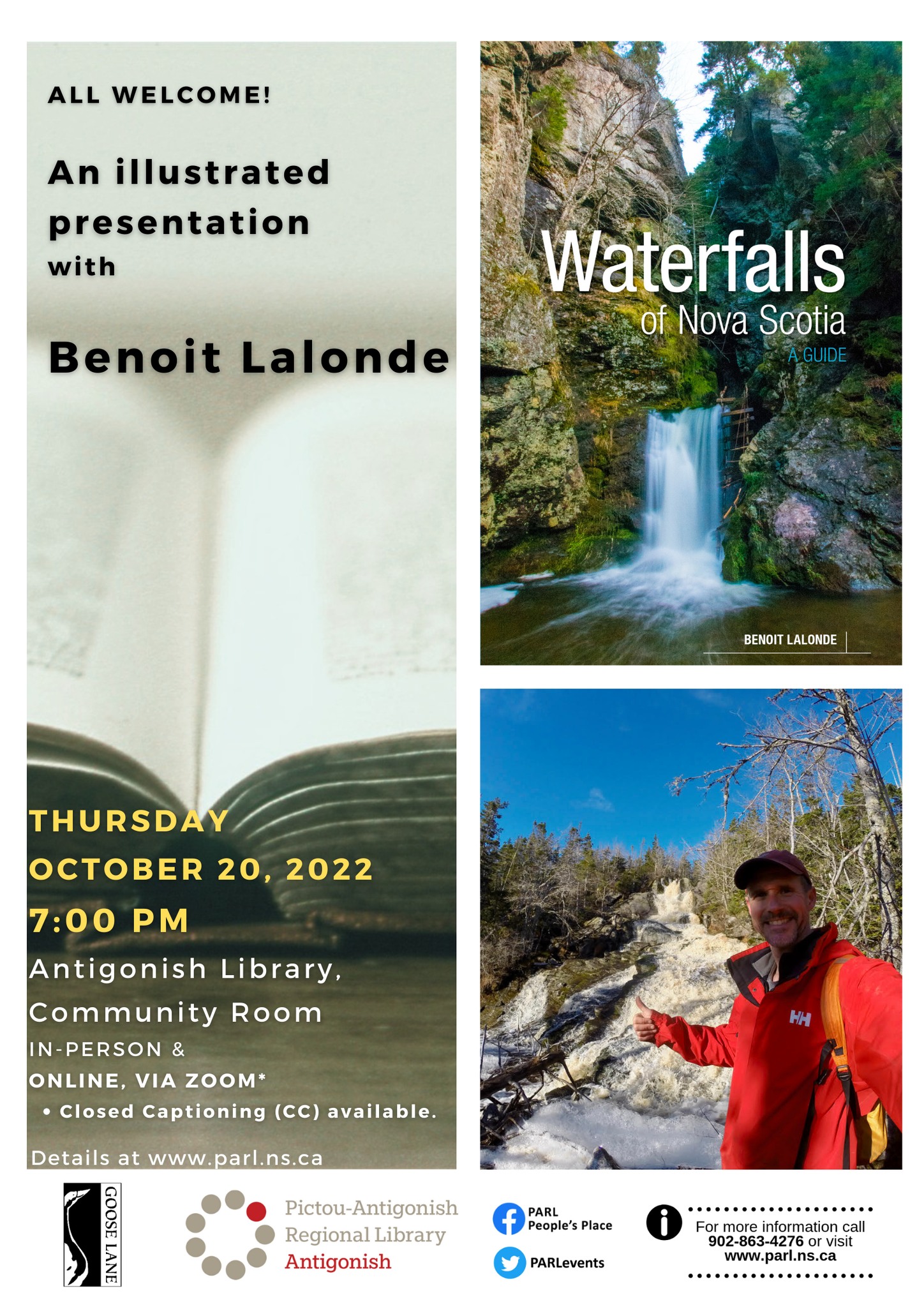 All are welcome to join us this evening for an illustrated presentation with local photographer, author, and adventurer, Benoit Lalonde, as he shares with us, one of his recently published guide books– “Waterfalls of Nova Scotia”.